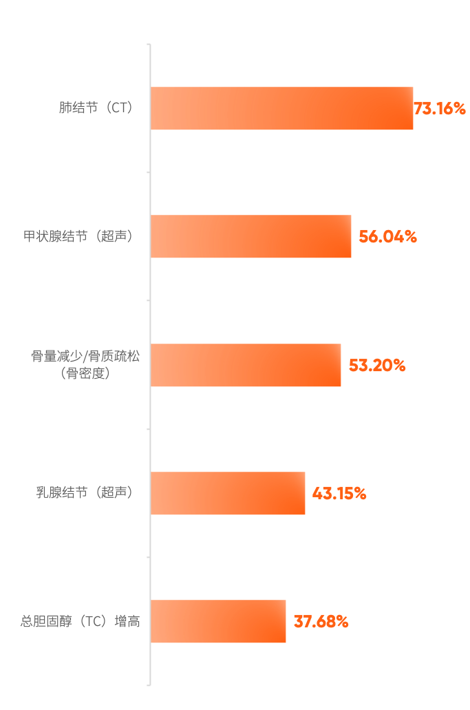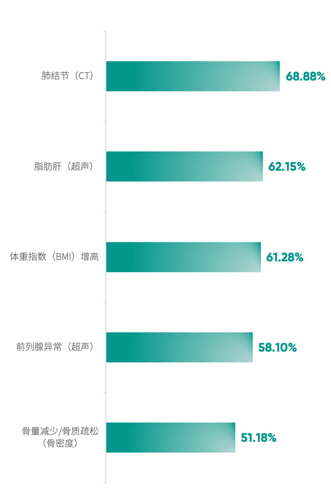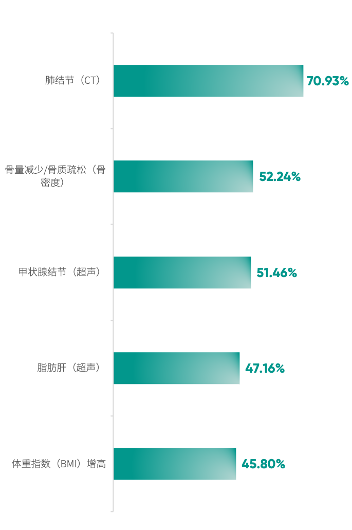 排除与性别相关的项目后,上海市体检人群中检出率排名前五的异常依次是:肺结节(CT)、骨量减少/骨质疏松(骨密度)、甲状腺结节(超声)、脂肪肝(超声)及体重指数(BMI)增高。