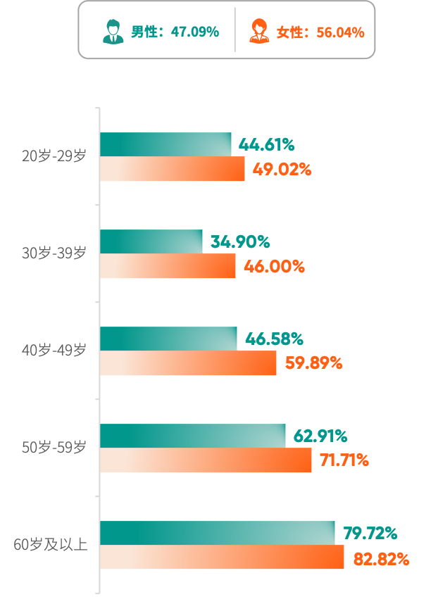 对于上海市男性体检人群,覆盖最广泛的健康问题是肺结节,往下依次为脂肪肝、 体重指数(BMI)增高 、前列腺异常、骨量减少/骨质疏松,检出率均在50%以上。