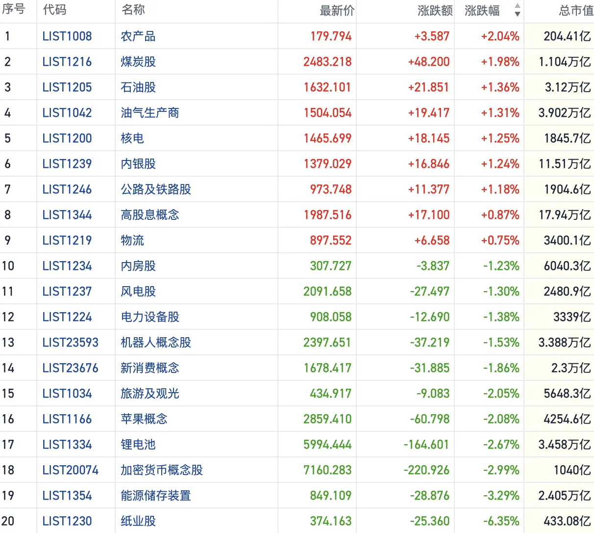 行情层面,今日各大热门板块涨跌分化,多头明显向煤炭、油气、银行等红利防御板块集中。而锂电、机器人等高位热点概念重挫。