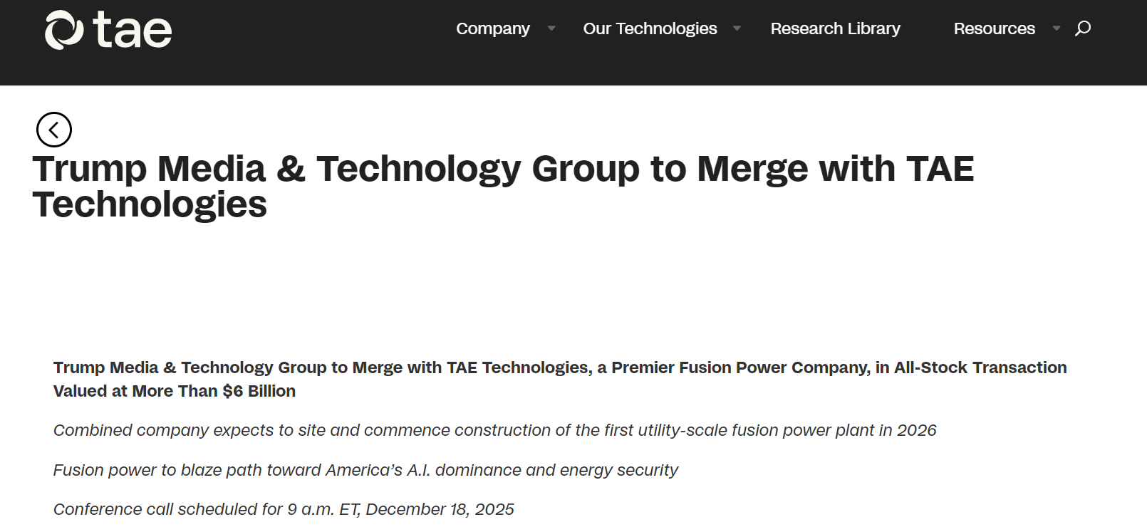 根据协议,交易完成后,特朗普旗下的媒体公司与TAE Technologies的股东将各自拥有合并后公司约50%的股份。交易预计于2026年年中完成,每股TAE股票定价为53.89美元。