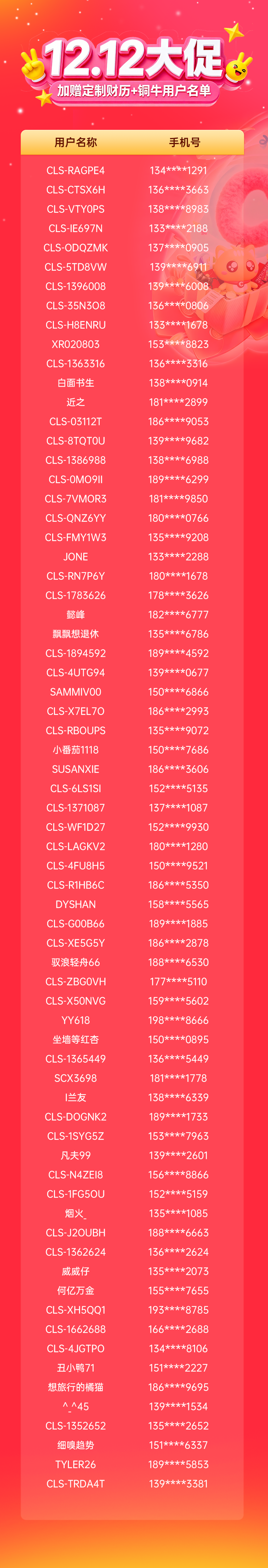 随着财联社VIP双12年末大促圆满落幕,活动推出的“包年添牛加财”迎来激动人心的名单公示环节!本次活动中,所有在双十二期间成功购买财联社包年服务的用户,均已自动获得本次福利的资格,将免费领取由财联社精心打造的两大专属定制好礼—2026年定制财历与定制铜牛摆件,感谢每一位用户的选择与陪伴!