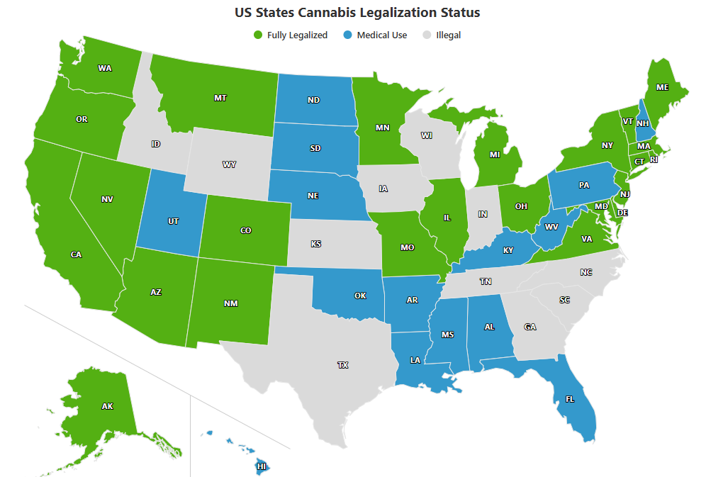 根据ETF提供商AdvisorShares官网,截至11月30日,美国37个州和首都华盛顿都已经将医用大麻合法化,另有24个州将其娱乐用途合法化。