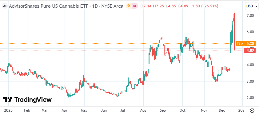 行情显示,截至周四美股收盘,大麻ETF“AdvisorShares Pure US Cannabis ETF”(代码:MSOS)下跌26.91%,回吐了本周所有涨幅,上一次录得这样的单日跌幅还是在2024年11月6日。
