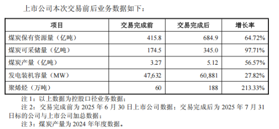 公告数据显示,本次交易完成后,中国神华的煤炭保有资源量将从交易前的415.8亿吨飙升至684.9亿吨,增幅高达64.72%;煤炭可采储量将由174.5亿吨增加至345.0亿吨,几近翻倍,增幅达97.71%。在产能方面,公司煤炭核定产能将提升至5.12亿吨/年,增幅达56.57%。