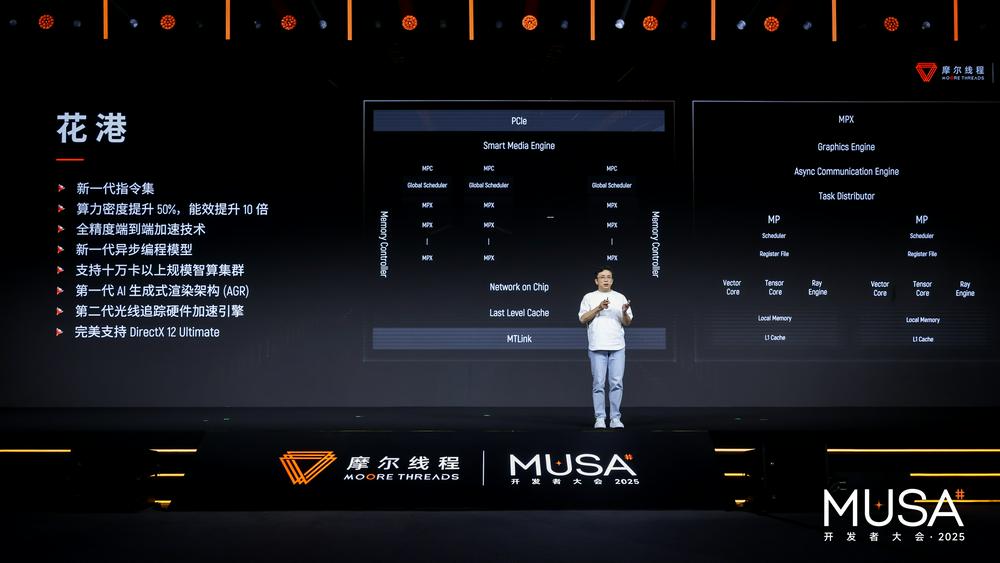 会上发布的摩尔线程新一代GPU架构“花港”,支持十万卡以上规模智算集群扩展。