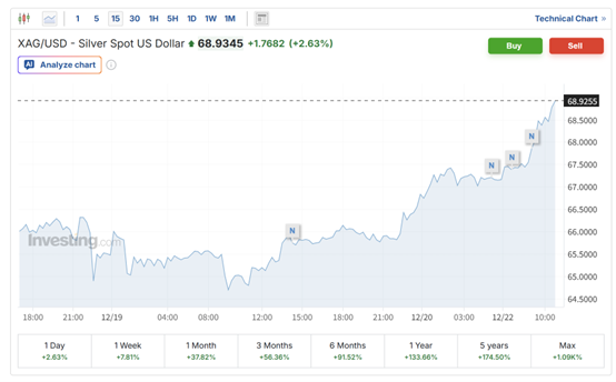 现货白银报68.93美元/盎司,日内上涨约2.6%。COMEX白银期货也涨逾2%,目前交易在69美元上方。