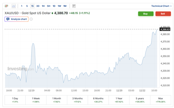行情数据显示,截至目前,现货黄金报4386.7美元/盎司,日内涨超1%,盘中一度站上4390美元。COMEX黄金期货价格报4419.2美元/盎司,日内涨超0.7%。