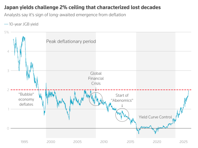 上周五,在日本央行上调利率至三十年高位并暗示将进一步收紧政策后,日本10年期国债收益率一度突破了2%大关,刷新了26年来的最高位。