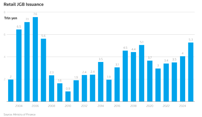 而今年,更高的日债收益率其实已成功吸引到了不少买家。数据显示,2025年日本零售国债销售额跃升30.5%至5.28万亿日元(约合335.5亿美元),创2007年以来新高。
