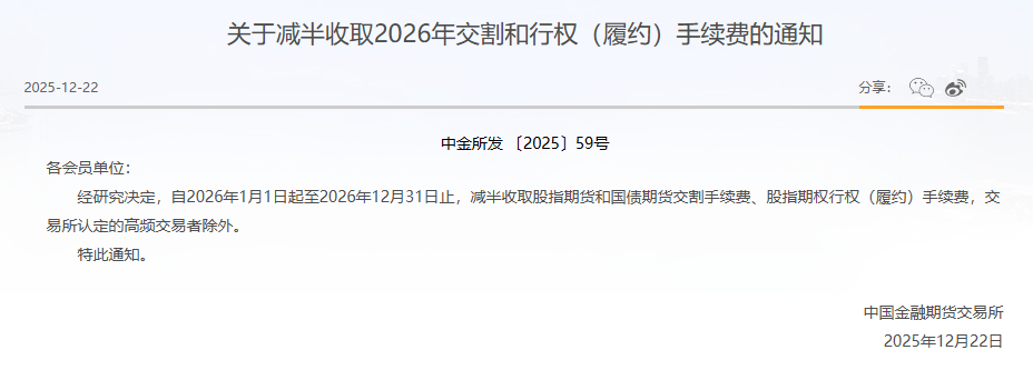 财联社12月22日讯,中金所公告,自2026年1月1日起至2026年12月31日止,减半收取股指期货和国债期货交割手续费、股指期权行权(履约)手续费,交易所认定的高频交易者除外。