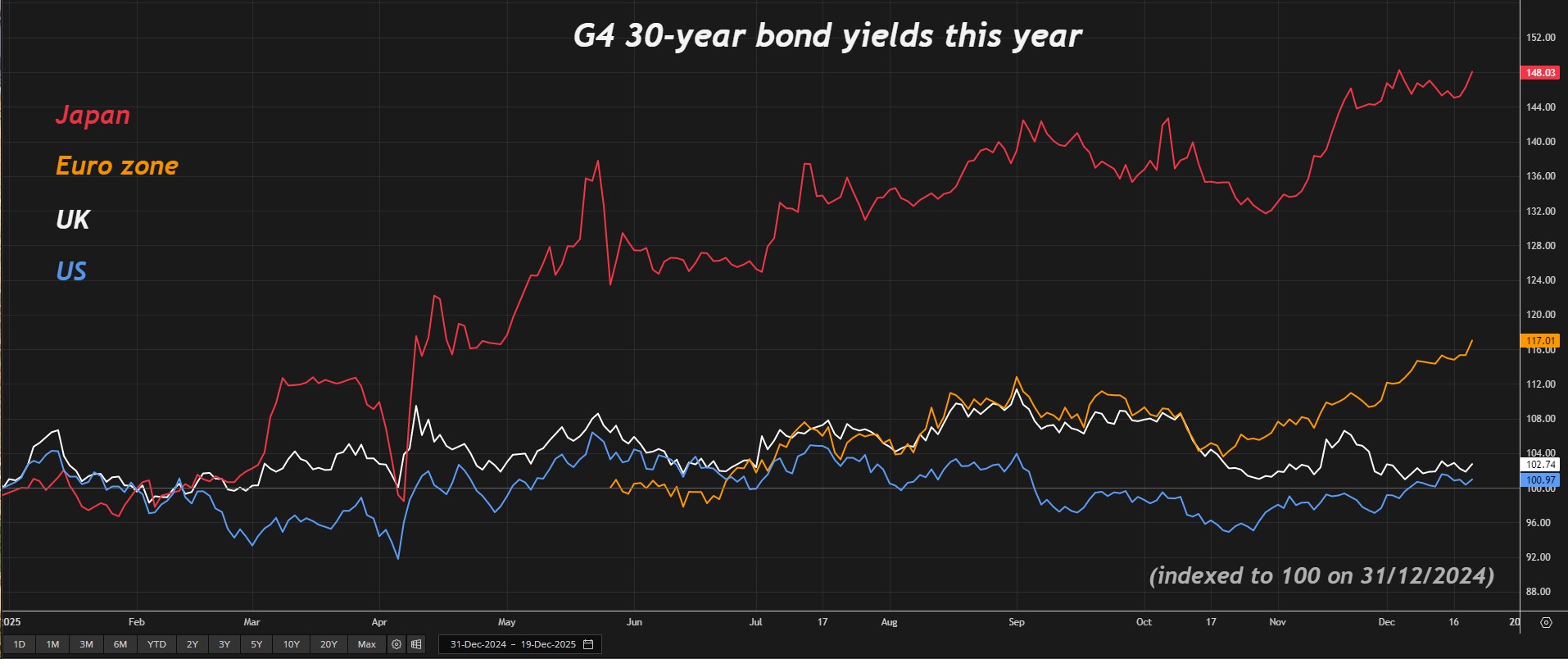 相较于国际同类债券,美国长期债券今年的表现也堪称稳健,尽管美元贬值10%导致其经汇率调整后的光彩略显黯淡。德国30年期国债收益率最近达到了2011年以来的最高水平,今年已累计上涨近100个基点;而日本30年期国债收益率也创历史新高,今年同样上涨超过100个基点。