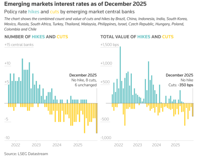 年底的这轮降息浪潮使2025年新兴经济体累计降息幅度达3085个基点(共51次行动),远超2024年的2160个基点,创下至少2021年疫情以来最大的宽松力度。