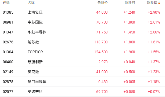 财联社12月24日讯(编辑 胡家荣)受益涨价预期,港股半导体股走强。截至发稿,上海复旦(01385.HK)涨2.90%、中芯国际(00981.HK)涨2.61%、华虹半导体(01347.HK)涨2.06%。