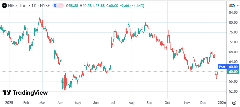 受该消息影响,耐克股价日内一度升至60.58美元,涨幅最大时达到5.6%。截至收盘,耐克涨幅收窄至4.64%报60美元。年初至今,该股已累跌近19%,势将录得连续第四年下跌。