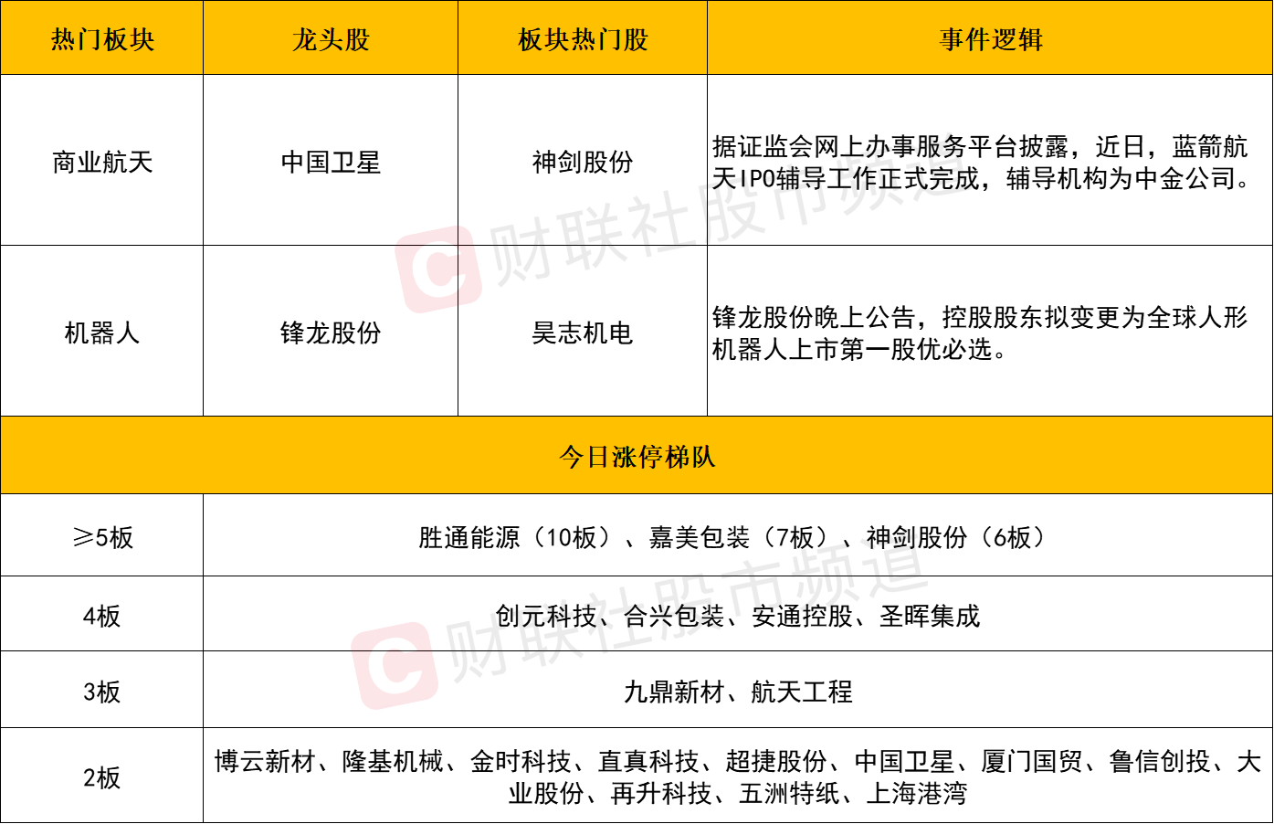 商业航天概念股全线爆发,广联航空、超捷股份、神剑股份、中国卫星、上海港湾、中天火箭、航天电子、金风科技、再升科技等个股涨停。