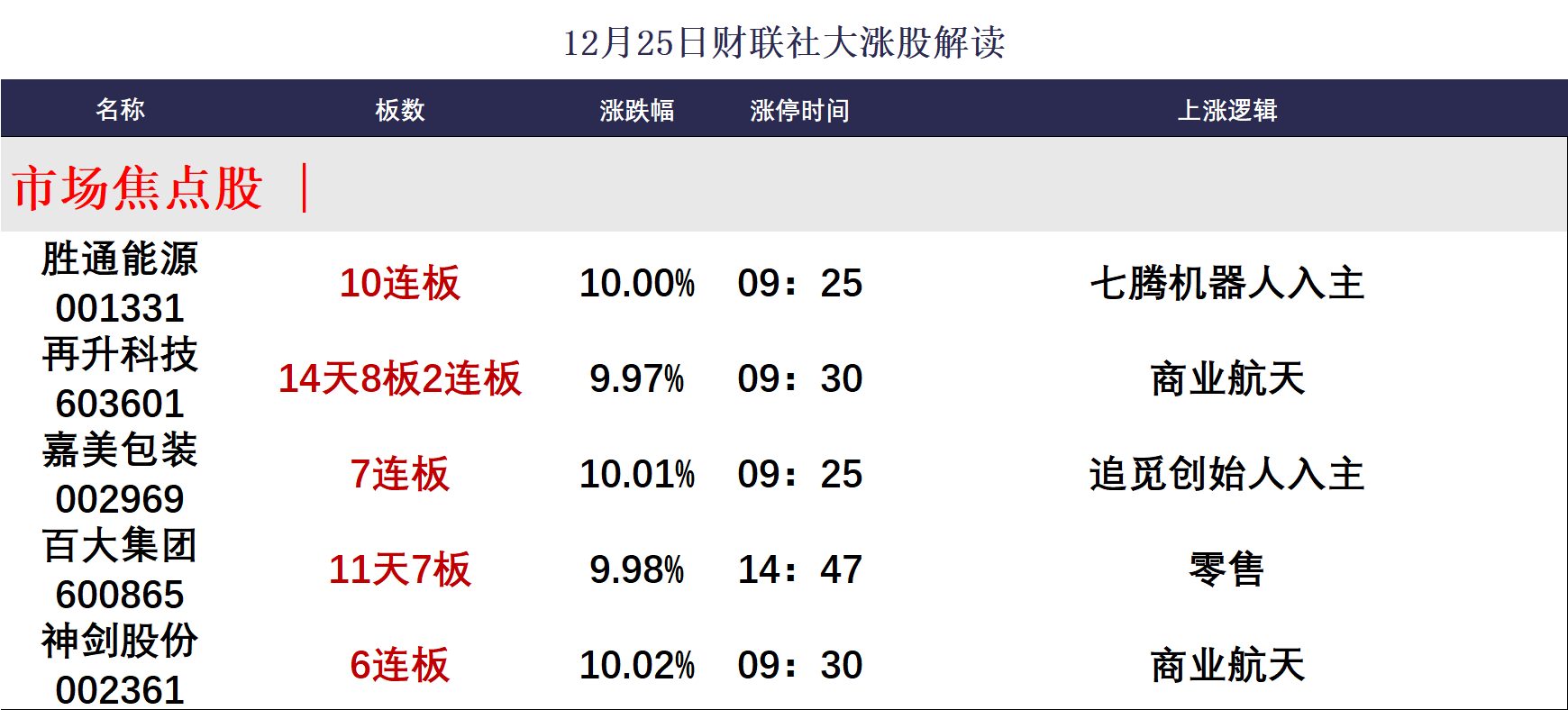 财联社12月25日讯,今日79股涨停,24股炸板,封板率为77%,胜通能源10连板,嘉美包装10天8板,神剑股份6连板,圣晖集成、安通控股、创元科技、合兴包装4连板,再升科技14天8板,百大集团11天7板,航天工程5天4板。沪指低开高走录得7连阳,深成指、创业板指探底回升。沪深两市成交额1.92万亿,较上一个交易日放量443亿。盘面上,市场热点快速轮动,全市场超3700只个股上涨。截至收盘,沪指涨0.47%,深成指涨0.33%,创业板指涨0.3%。