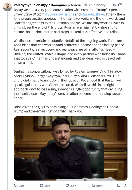 财联社12月26日讯(编辑 卞纯)综合央视新闻等媒体报道,当地时间25日,乌克兰总统泽连斯基在社交媒体平台X上发布消息称,当日他与美国总统特朗普的特使史蒂文·威特科夫、特朗普女婿贾里德·库什纳举行了良好的通话