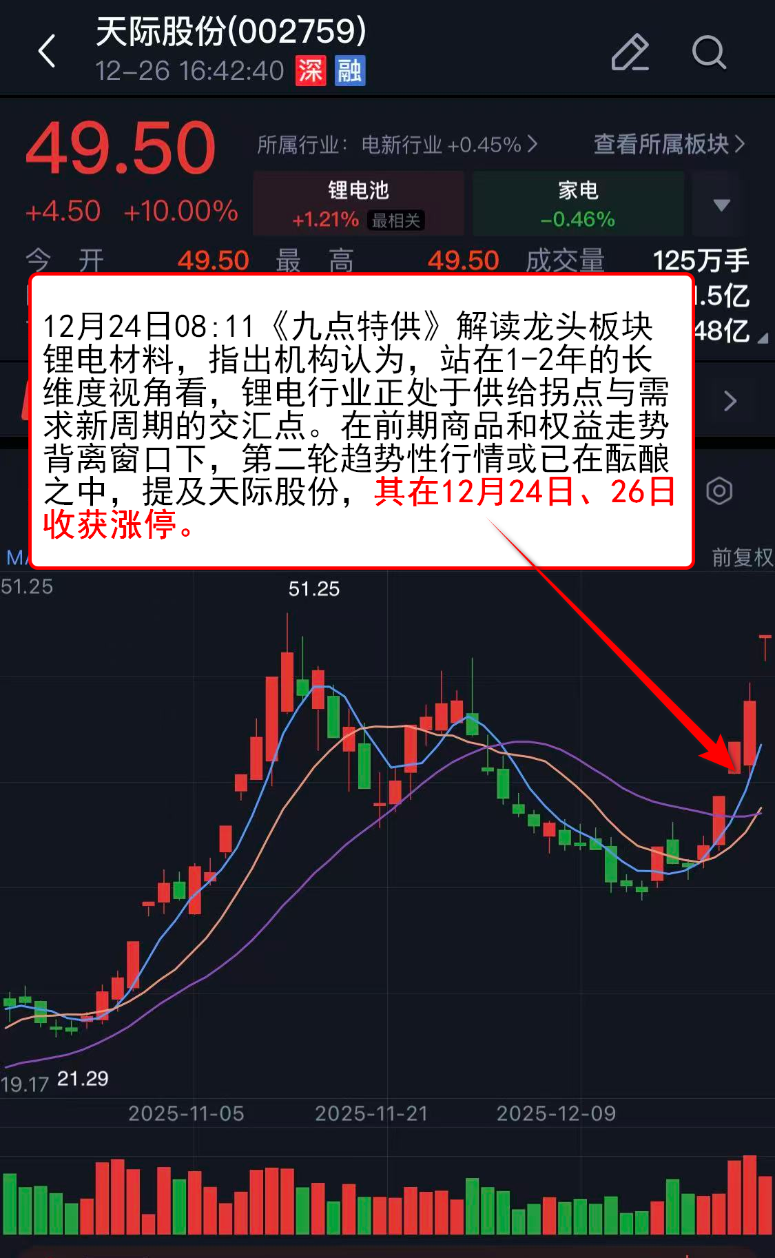 12月24日08:11《九点特供》解读龙头板块锂电材料,指出机构认为,站在1-2年的长维度视角看,锂电行业正处于供给拐点与需求新周期的交汇点。在前期商品和权益走势背离窗口下,第二轮趋势性行情或已在酝酿之中,提及天际股份,其在12月24日、26日收获涨停。