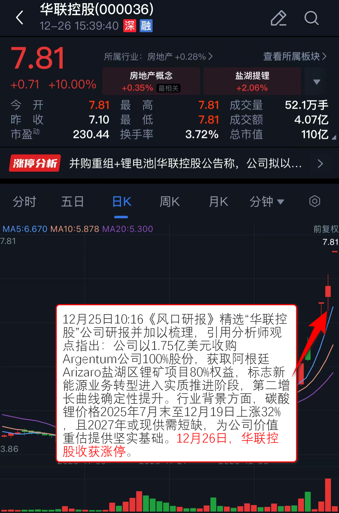 12月25日10:16《风口研报》精选“华联控股”公司研报并加以梳理,引用分析师观点指出:公司以1.75亿美元收购Argentum公司100%股份,获取阿根廷Arizaro盐湖区锂矿项目80%权益,标志新能源业务转型进入实质推进阶段,第二增长曲线确定性提升。行业背景方面,碳酸锂价格2025年7月末至12月19日上涨32%,且2027年或现供需短缺,为公司价值重估提供坚实基础。12月26日,华联控股收获涨停。