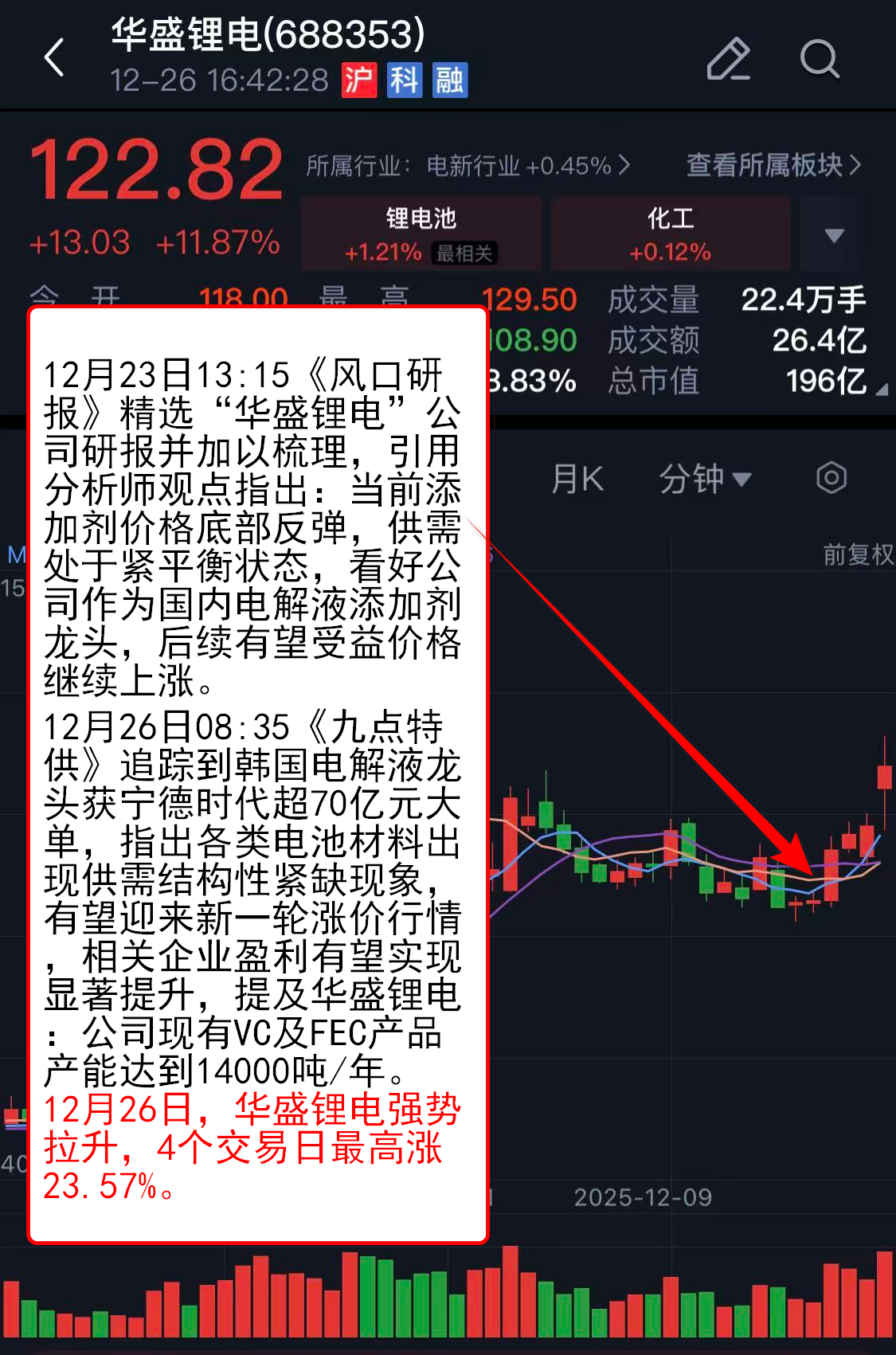 12月26日,华盛锂电强势拉升,4个交易日最高涨23.57%。