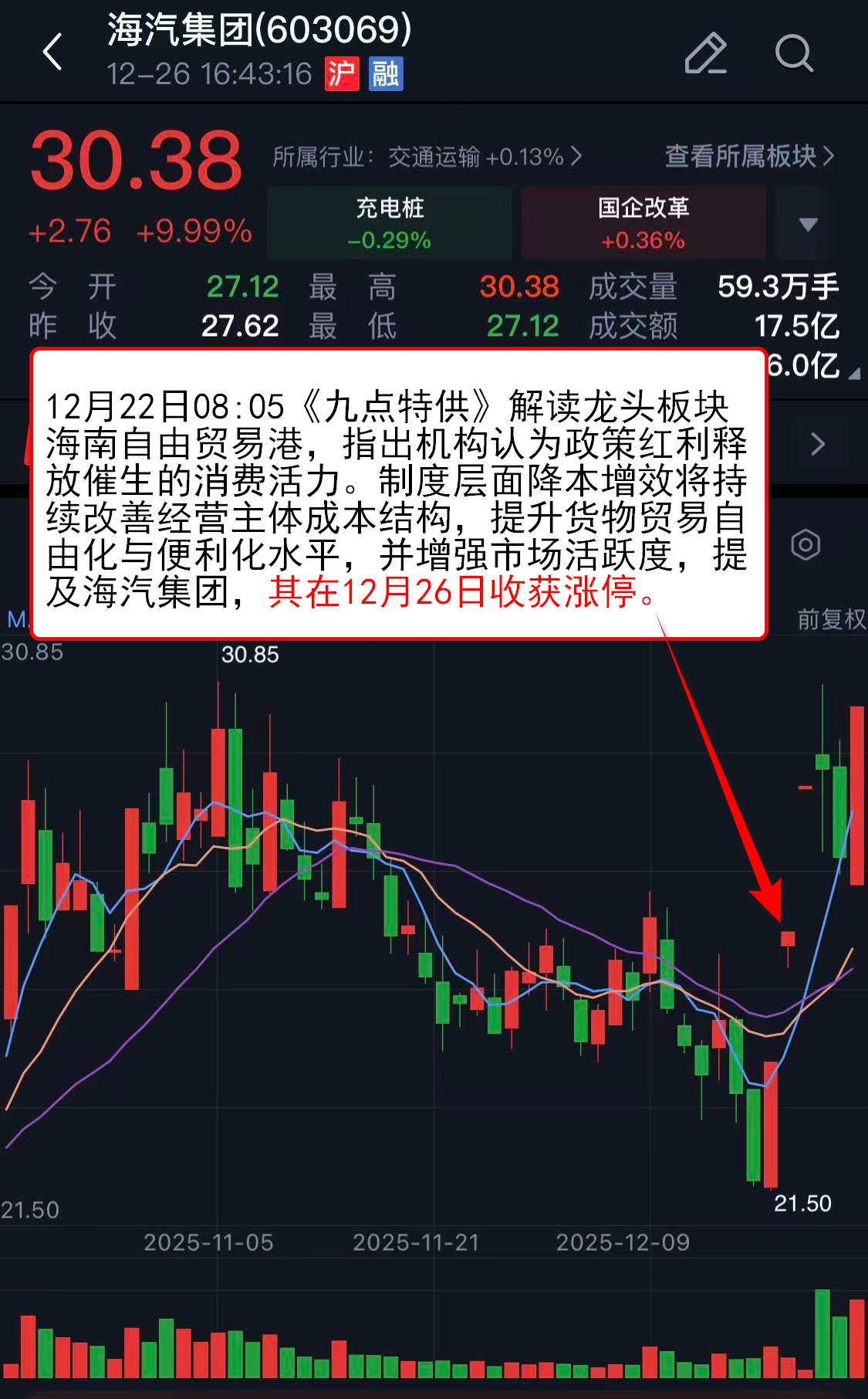 12月22日08:05《九点特供》解读龙头板块海南自由贸易港,指出机构认为政策红利释放催生的消费活力。制度层面降本增效将持续改善经营主体成本结构,提升货物贸易自由化与便利化水平,并增强市场活跃度,提及海汽集团,其在12月26日收获涨停。
