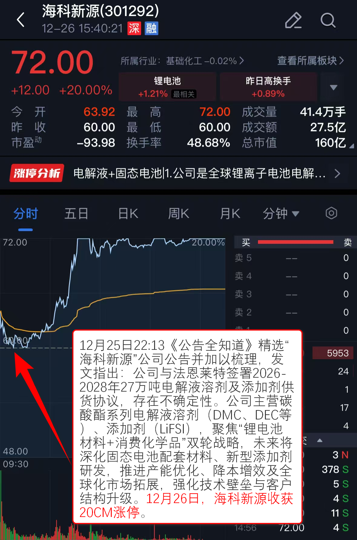 12月25日22:13《公告全知道》精选“海科新源”公司公告并加以梳理,发文指出:公司与法恩莱特签署2026-2028年27万吨电解液溶剂及添加剂供货协议,存在不确定性。公司主营碳酸酯系列电解液溶剂(DMC、DEC等)、添加剂(LiFSI),聚焦“锂电池材料+消费化学品”双轮战略,未来将深化固态电池配套材料、新型添加剂研发,推进产能优化、降本增效及全球化市场拓展,强化技术壁垒与客户结构升级。12月26日,海科新源收获20CM涨停。