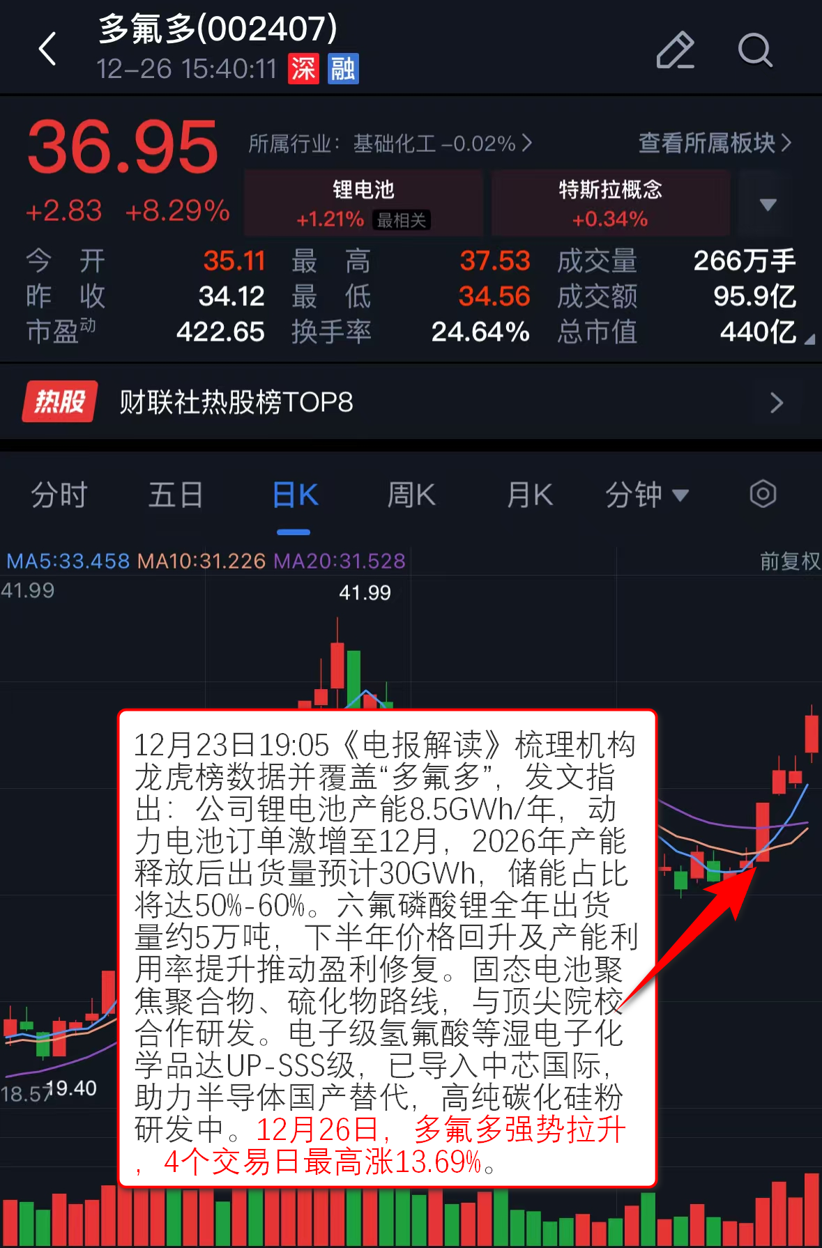12月23日19:05《电报解读》梳理机构龙虎榜数据并覆盖“多氟多”,发文指出:公司锂电池产能8.5GWh/年,动力电池订单激增至12月,2026年产能释放后出货量预计30GWh,储能占比将达50%-60%。六氟磷酸锂全年出货量约5万吨,下半年价格回升及产能利用率提升推动盈利修复。固态电池聚焦聚合物、硫化物路线,与顶尖院校合作研发。电子级氢氟酸等湿电子化学品达UP-SSS级,已导入中芯国际,助力半导体国产替代,高纯碳化硅粉研发中。12月26日,多氟多强势拉升,4个交易日最高涨13.69%。