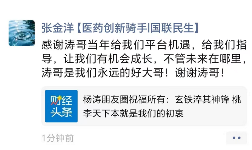 “感谢涛哥当年给我们平台机遇,给我们指导,让我们有机会成长,不管未来在哪里,涛哥是我们永远的好大哥!谢谢涛哥!”张金洋在朋友圈中谈道。