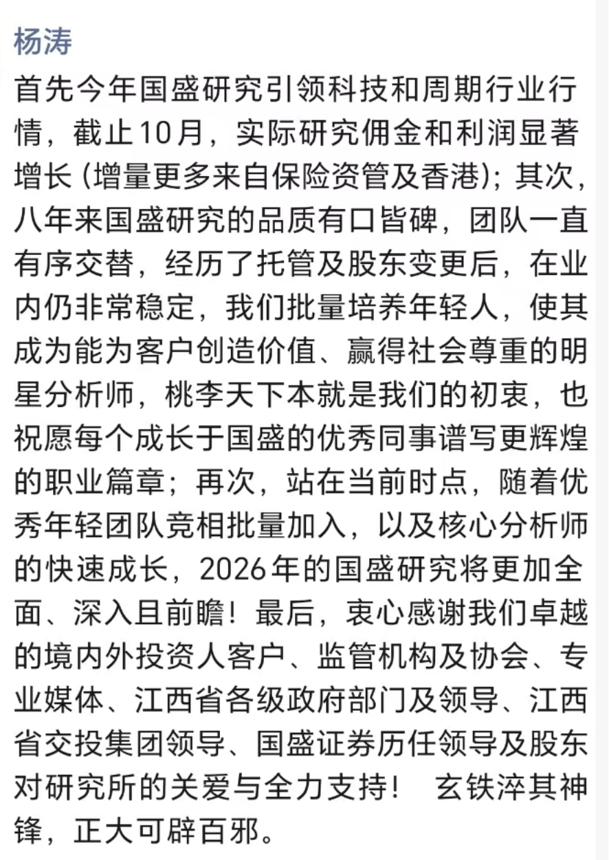 “我们批量培养年轻人,使其成为能为客户创造价值、赢得社会尊重的明星分析师,祝愿每个成长于国盛的优秀同事谱写更辉煌的职业篇章。”杨涛还在朋友圈中表达,并且提到,站在当前时点,随着优秀年轻团队竞相批量加入,以及核心分析师的快速成长,2026年的国盛研究将更加全面、深入且前瞻。