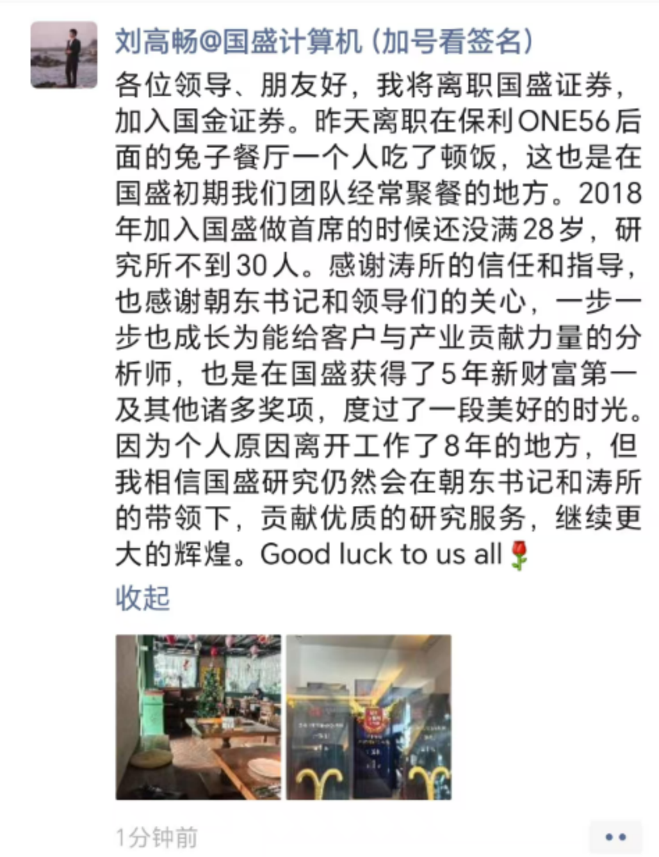 刘高畅在朋友中谈到,在国盛度过了一段美好时光,因为个人原因离开工作了8年的地方,但相信国盛研究仍然会在朝东书记和涛所的带领下,贡献优质的研究服务,继续更大的辉煌。