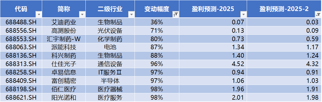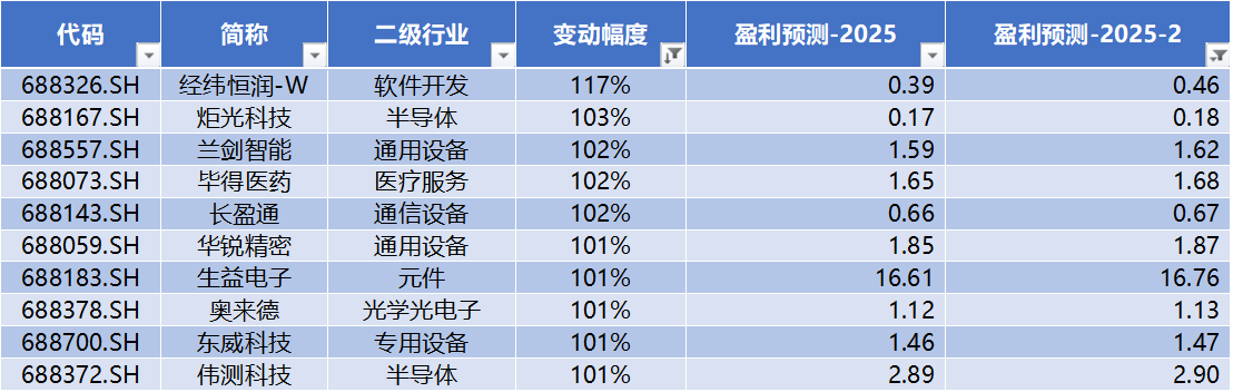 上表是本周盈利预测(规模净利润预测值)中值上调/下移的公司,其中上调有10家,本文选取其中幅度最大的前十家(若不足十家则按实际数量列示),分别为:经纬恒润-W、炬光科技、兰剑智能、毕得医药、长盈通、华锐精密、生益电子、奥来德、东威科技、伟测科技。
