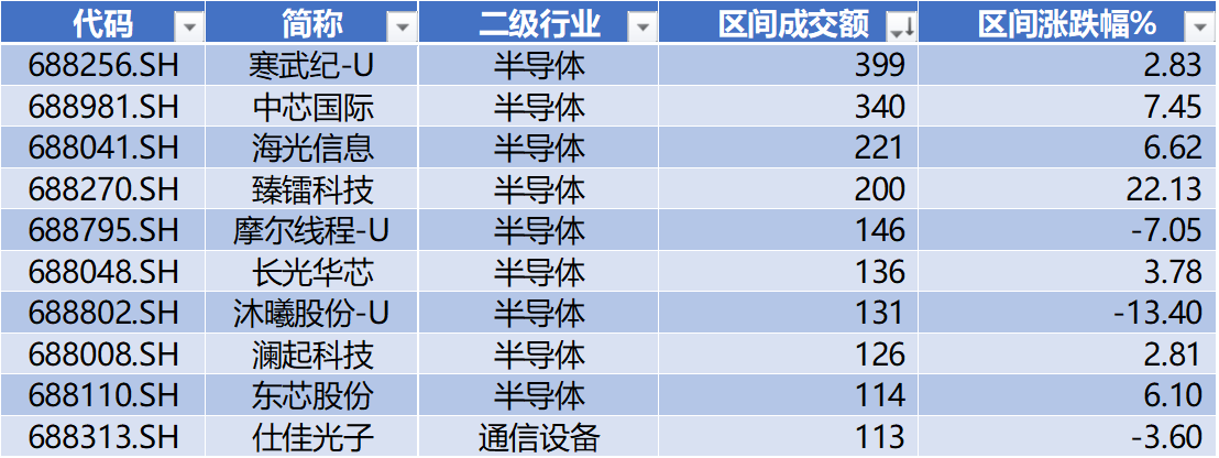 上表是本周成交额(亿)前十公司,分别为:寒武纪-U、中芯国际、海光信息、臻镭科技、摩尔线程-U、长光华芯、沐曦股份-U、澜起科技、东芯股份、仕佳光子。