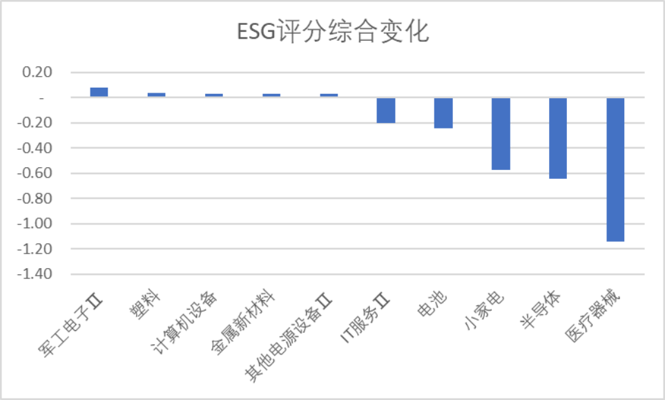 上图是本周ESG评分变化行业分布,本文统计了排名最高和最低的5个行业,本周ESG评分变化排名变化最大的细分行业:军工电子、塑料、计算机设备。