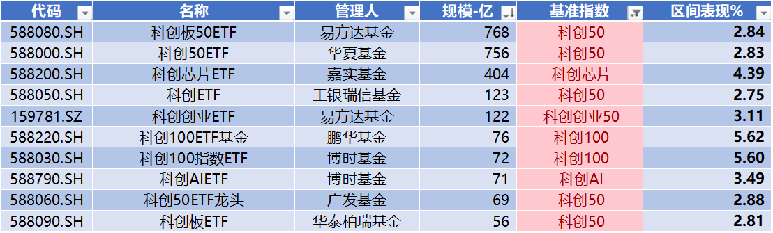 上表是按照最新规模统计,最大的10只科创板相关公募基金,各自有跟踪指数。规模较大的科创板ETF大致可分为三类:科创50、科创100、双创50。