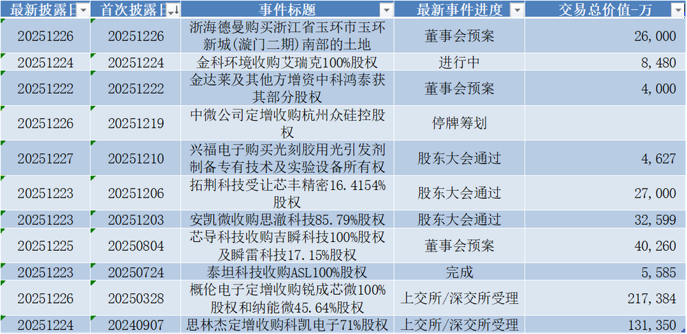 2、本周科创板并购最新进展共11条,其中属于本周首次披露的有3条:浙海德曼购买浙江省玉环市玉环新城(漩门二期)南部的土地、金科环境收购艾瑞克100%股权、金达莱及其他方增资中科鸿泰获其部分股权。