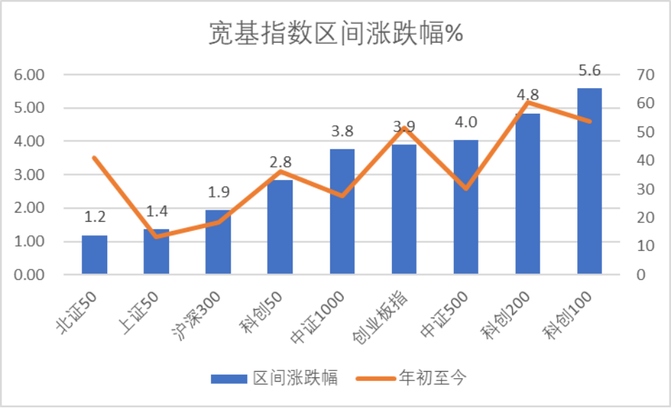 如上图,本周A股主要宽基指数呈现普涨,其中科创50涨2.8%略低于中位数,科创100、科创200居前。
