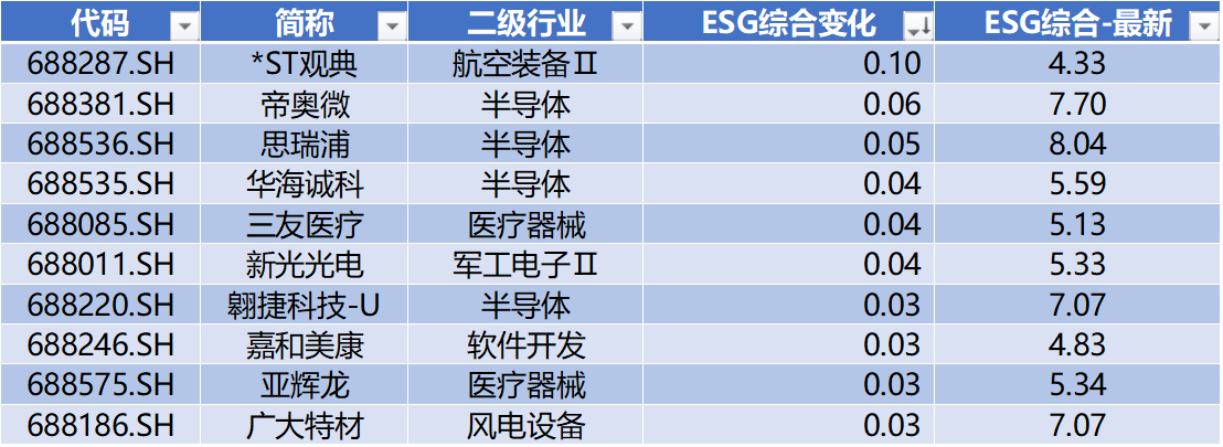 上表是ESG评分变化上升的前十家公司(剔除新上市公司),分别为:*ST观典、帝奥微、思瑞浦、华海诚科、三友医疗、新光光电、翱捷科技-U、嘉和美康、亚辉龙、广大特材。