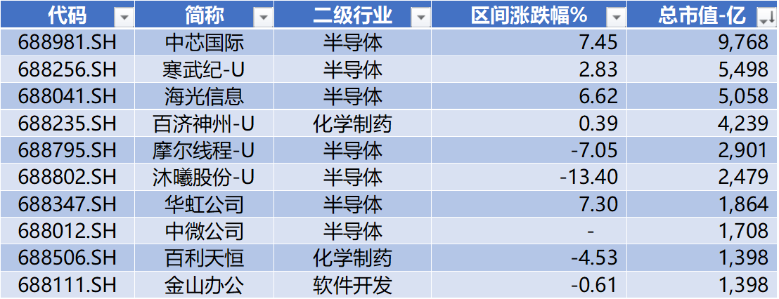上图是本周科创板前十大权重公司呈现普跌,中芯国际涨7.5%居前,沐曦股份跌13.4%居末。