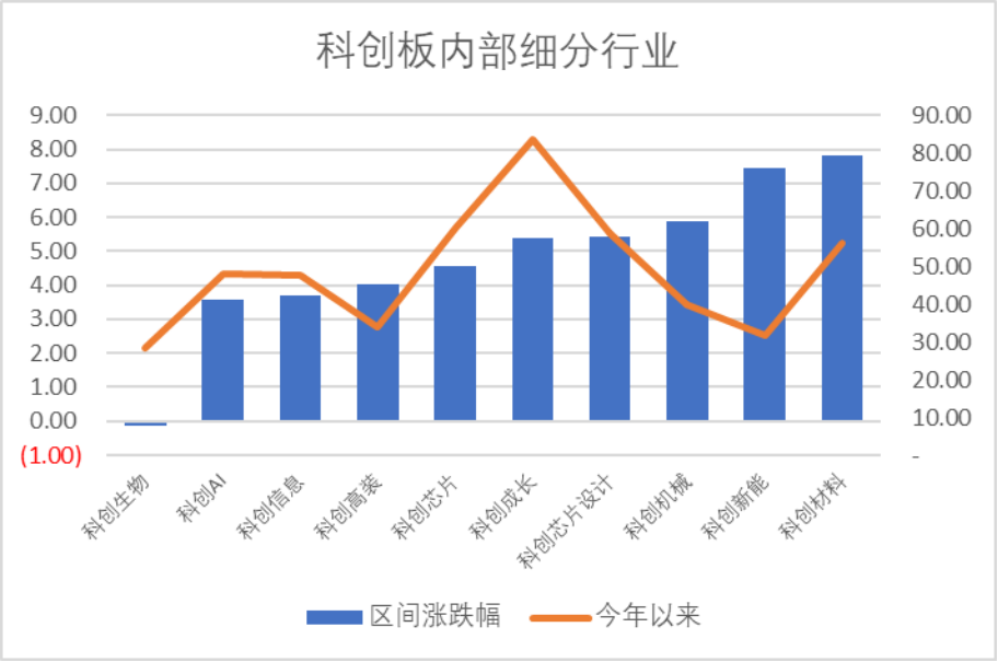 如上图所示,本周科创板内部呈现普涨,新材料板块居前,生物医药板块居末。