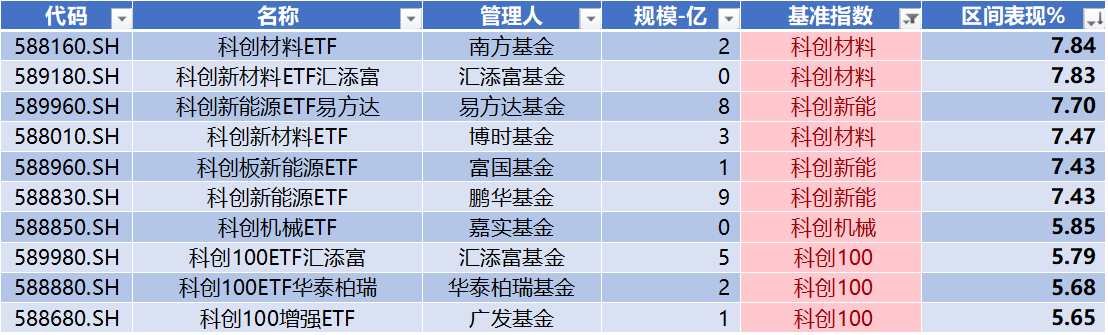 上表是本周市场表现按照降序排列的科创板ETF基金,本文选取前十名。本周科创板ETF中,新材料与新能源主题ETF产品表现较好。