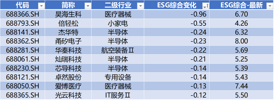 上表是ESG评分变化下降的前十家公司,分别为:昊海生科、倍轻松、杰华特、甬矽电子、华秦科技、灿瑞科技、芯导科技、卓然股份、爱博医疗、光云科技。