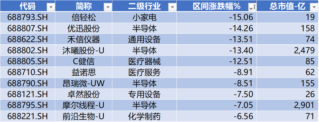 上表是本周跌幅榜前十公司,分别为:倍轻松、优迅股份、禾信仪器、沐曦股份-U、C健信、益诺思、昂瑞微-UW、卓然股份、摩尔线程-U、前沿生物-U。
