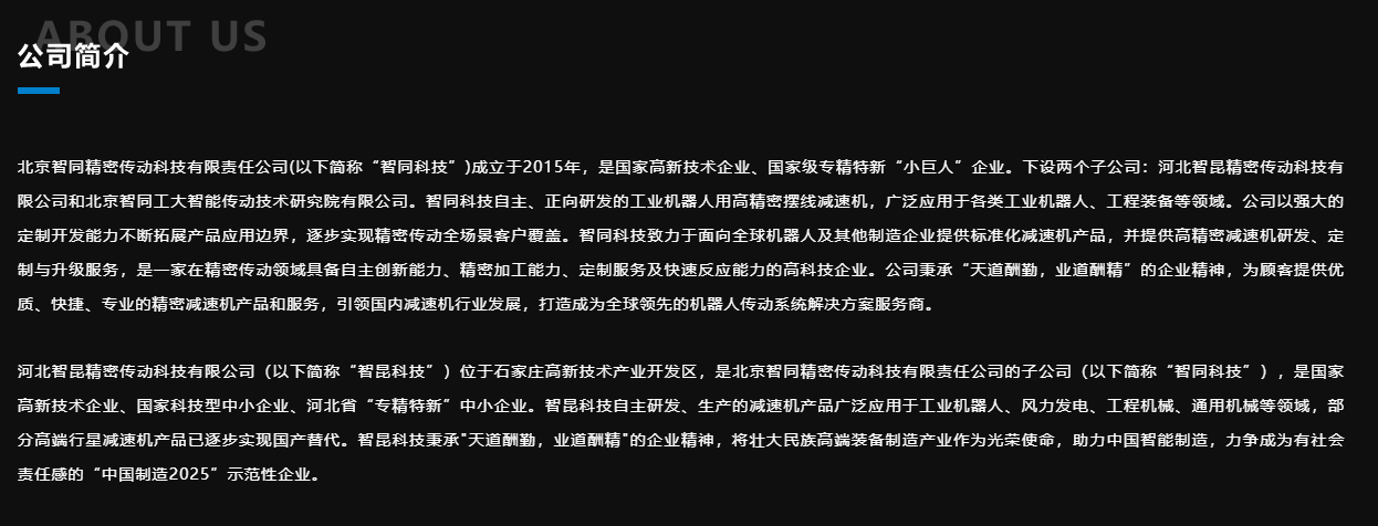 公司官网显示,智同科技致力于面向全球机器人及其他制造企业提供标准化减速机产品,并提供高精密减速机研发、定制与升级服务。