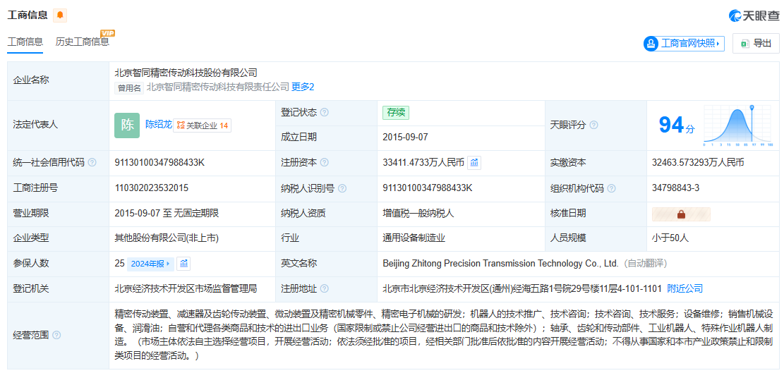 天眼查工商信息显示,北京智同精密传动科技股份有限公司成立于2015年9月。