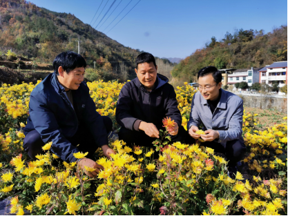 图:中国人寿派驻驻村干部查看帮扶产业金丝皇菊种植情况