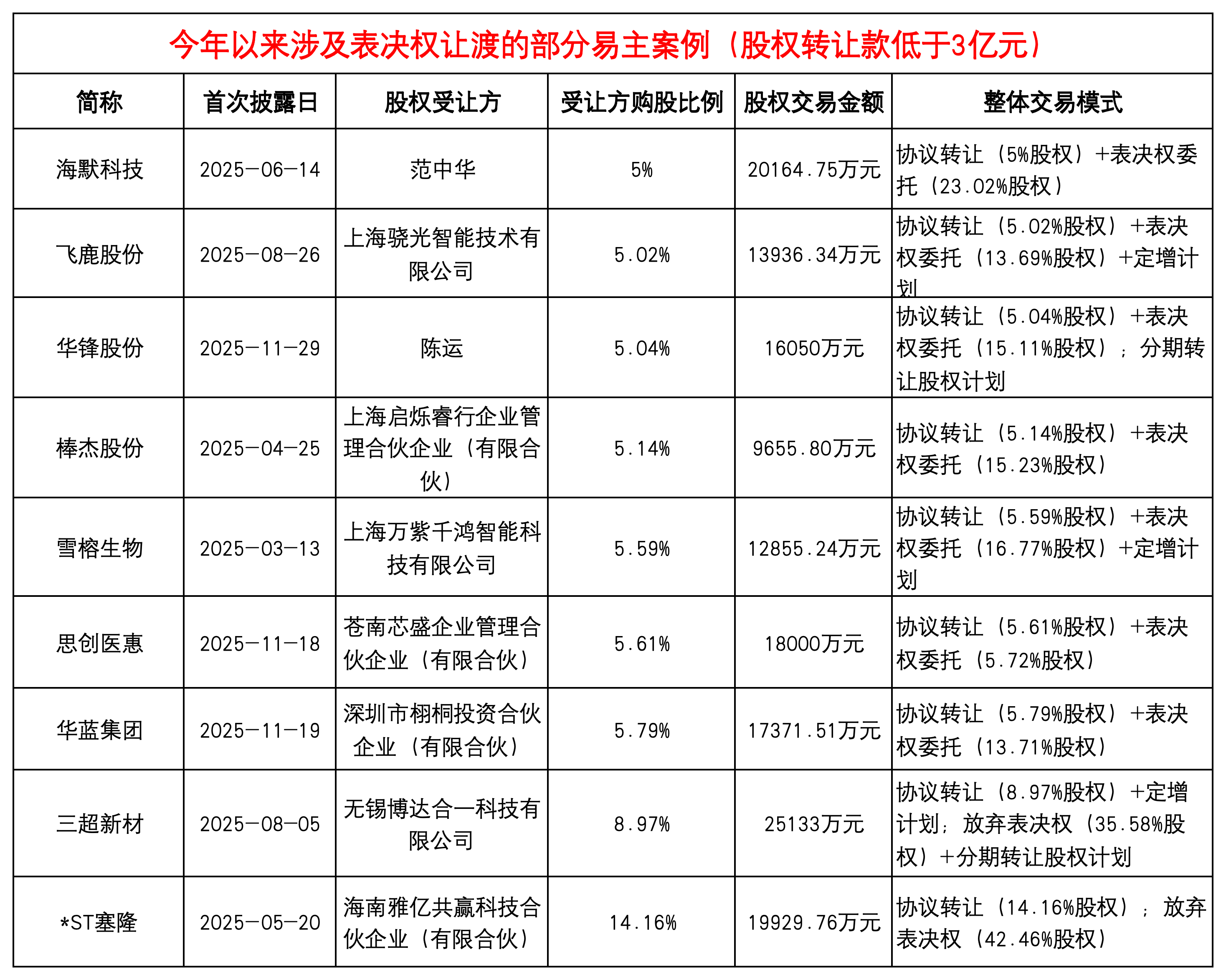 今年,A股上市公司易主大潮波澜壮阔,涉及上市公司已超300家,在上纬新材(688585.SH)、胜通能源(001331.SZ)等一系列标杆案例的“示范”下,易主概念股行情热度不断抬升。但同时,上市公司的易主门槛却不断“刷新下限”,甚至不到1亿元资金或持股未达5%举牌线都可撬动上市公司的控股权,其中的杠杆正是表决权委托、表决权放弃等设计安排。