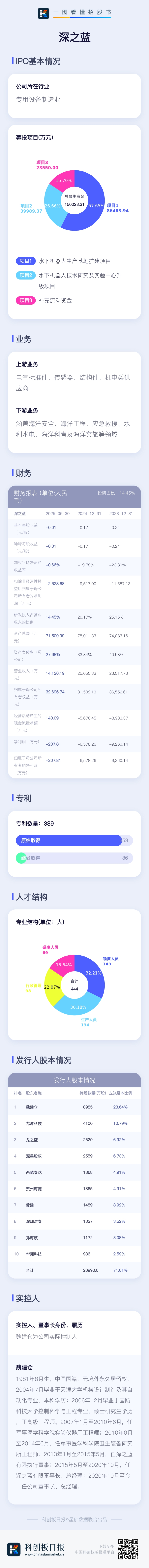 ①截至2024年12月31日,该公司共有研发人员77人,占员工总数的比例为18.73%; ②此次IPO,深之蓝拟募资15亿元,所募集资金主要用于水下机器人生产基地扩建项目、水下机器人技术研究及实验中心升级项目,以及补充流动资金。