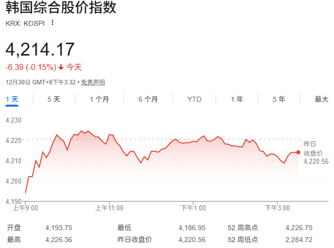 截至周二收盘,KOSPI指数4214.17点,收涨0.15%。