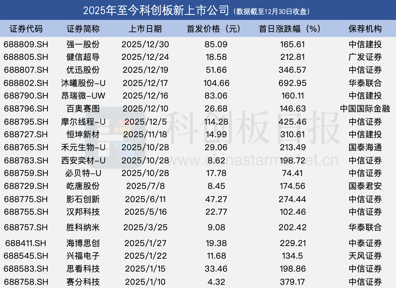 以上市首日涨幅排名,沐曦股份、摩尔线程、赛分科技为涨幅最高的三家公司;上述19家新上市公司中,有8家公司首发上市的保荐机构为中信证券。整体来看,2025年科创板新股延续了“零破发”态势。