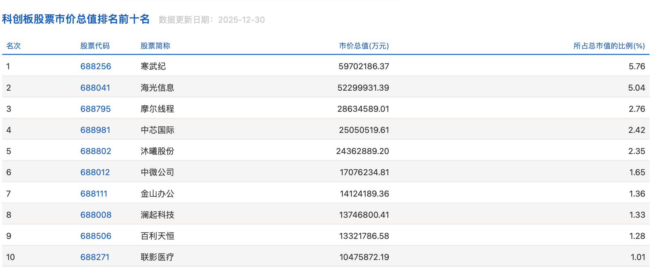 这一年,科创50指数在2024年度16.07%涨幅的基础上更进一步,从2025年初截至12月30日收盘,总共上涨了37.51%,约为2024年度涨幅的两倍。尤其是下半年以来,科创50指数大幅上涨39.18%,以摩尔线程、沐曦股份为代表的国产GPU龙头,在上市后不久,就进入科创板前十大市值公司榜单。